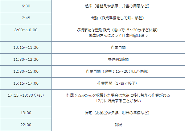 派遣先の農家さんや時期によって作業内容は変わりますが、私が通っていた農家さんはこのようなスケジュールでした。