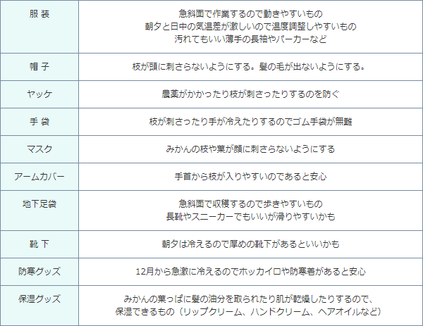 どれもホームセンターやドラッグストアで手に入るようなものばかりです。実際に働いてから買うのもいいでしょう。作業に使うハサミやテボ(かご)は農家さんで用意してくれます。