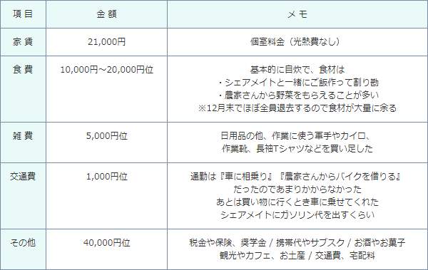 派遣先の農家さんやシェアハウスによって状況は異なりますが、給料や家賃などは同じです。