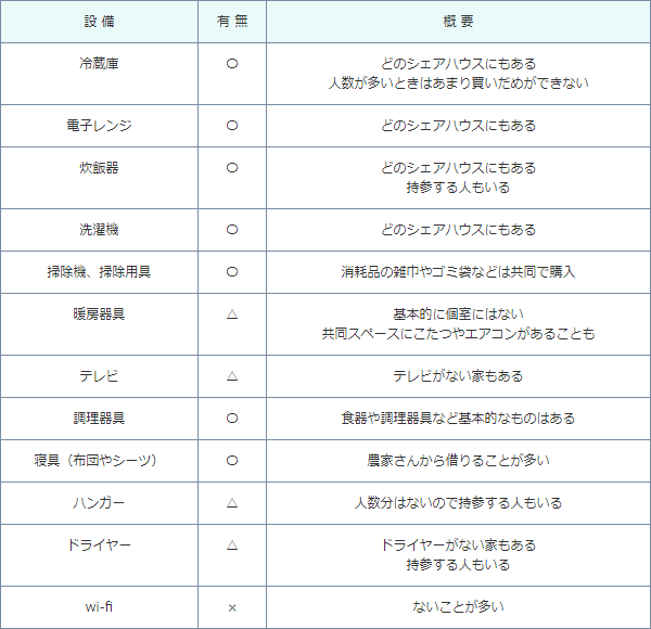 各シェアハウスによって設備が違いますが、基本的に用意されています。